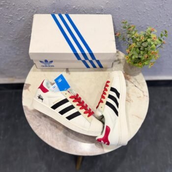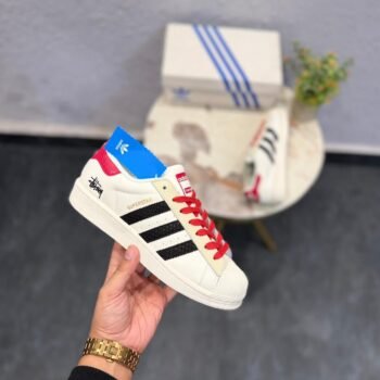 Superstar White Black Red sneakers bring a bold and clean street look. The white base feels fresh, while black and red accents add a sharp edge. The shell-style toe gives a classic touch.